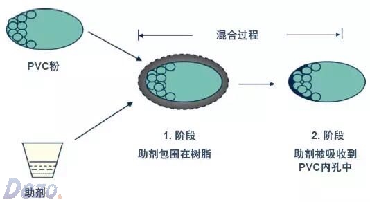 在這一過程中PVC樹脂顆粒在強力攪拌下,料溫在5O℃以下時,結(jié)團的粉粒和較大的顆粒被磨擦,沖擊顆粒粉碎變小,這時干混料的表觀密度變化不大而樹脂顆粒變小。料溫在80℃以上至120℃左右時,PVC樹脂顆粒膨脹變大(玻璃化溫度附近熱膨脹系數(shù)較大),顆粒尺寸趨于均勻,顆粒的平均尺寸與未混合的PVC樹脂顆粒相近。同時,由于顆粒吸收了助劑,干混料的表觀密度迅速增加。