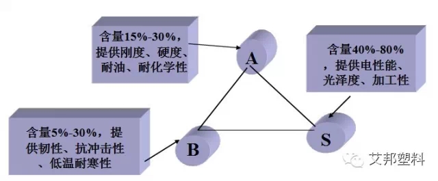 正因?yàn)锳BS的各組分擁有著不一樣的性能,所以當(dāng)ABS(丙烯腈-丁二烯-苯乙烯)將PAN、PB、PS統(tǒng)一起來(lái)的時(shí)候,就兼具了韌,硬,剛相均衡的優(yōu)良力學(xué)性能與化學(xué)性能。其性能也隨著各組分含量不一樣,組合方式不同,呈現(xiàn)出不一樣的ABS。