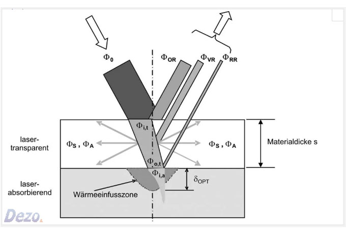 在塑料激光焊接過(guò)程中,激光打到上層穿透層塑料表面時(shí),一部分激光會(huì)反射掉,另一部分激光會(huì)折射進(jìn)入到塑料材料的內(nèi)部;進(jìn)入到塑料材料內(nèi)部的激光,一部分會(huì)穿透塑料材料抵達(dá)激光吸收層,而另一部分激光則在塑料材料內(nèi)部發(fā)生復(fù)雜的光路變化:有一些會(huì)被半晶顆粒漫反射、有一些被材料吸收、另一些經(jīng)過(guò)各種反射又會(huì)回到空氣中或者進(jìn)入到吸收層材料。在實(shí)際的生產(chǎn)中,激光一般都是垂直入射上層塑料,因此我們可以將上述簡(jiǎn)略分為:一部分激光被反射(R),一部分激光被吸收(A),一部分激光穿透上層塑料抵達(dá)吸收層(T)。上述T+A+R=1。