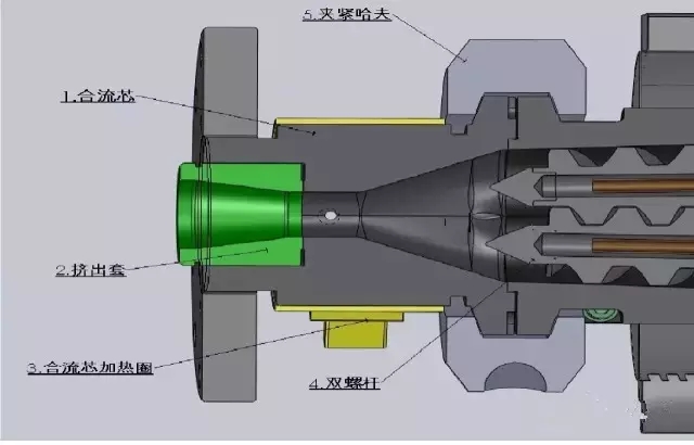 1、將兩根旋轉(zhuǎn)螺桿擠出的熔體物料達到合流、熔接為一體的作用。